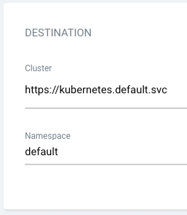For Destination, set cluster URL to https://kubernetes.default.svc (or in-cluster for cluster name) and namespace to default: